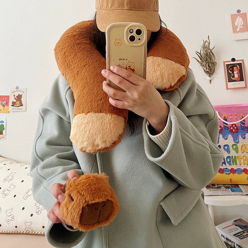 くまを抱きしめるような癒しのデザインで、旅行やお昼寝タイムをより楽しく演出するネックピローです。