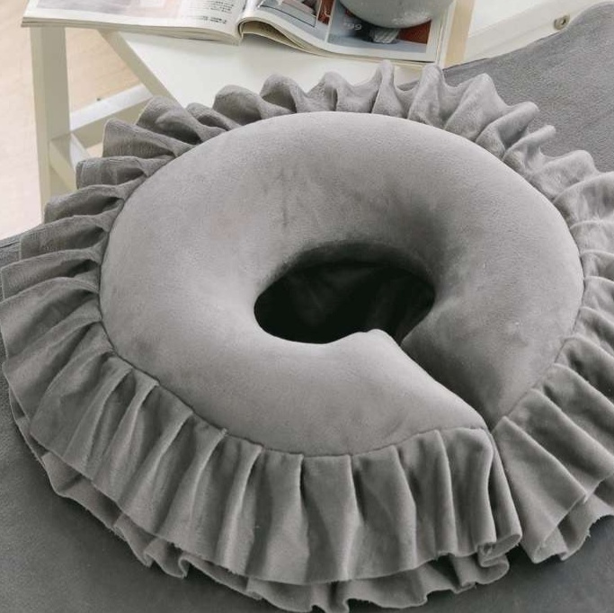 贅沢なフリル付きの低反発ネックピローです。洗濯可能で形崩れしにくく、美容サロンでの施術時やご自宅でのリラックスタイムに最適な柔らかい質感の枕です。
